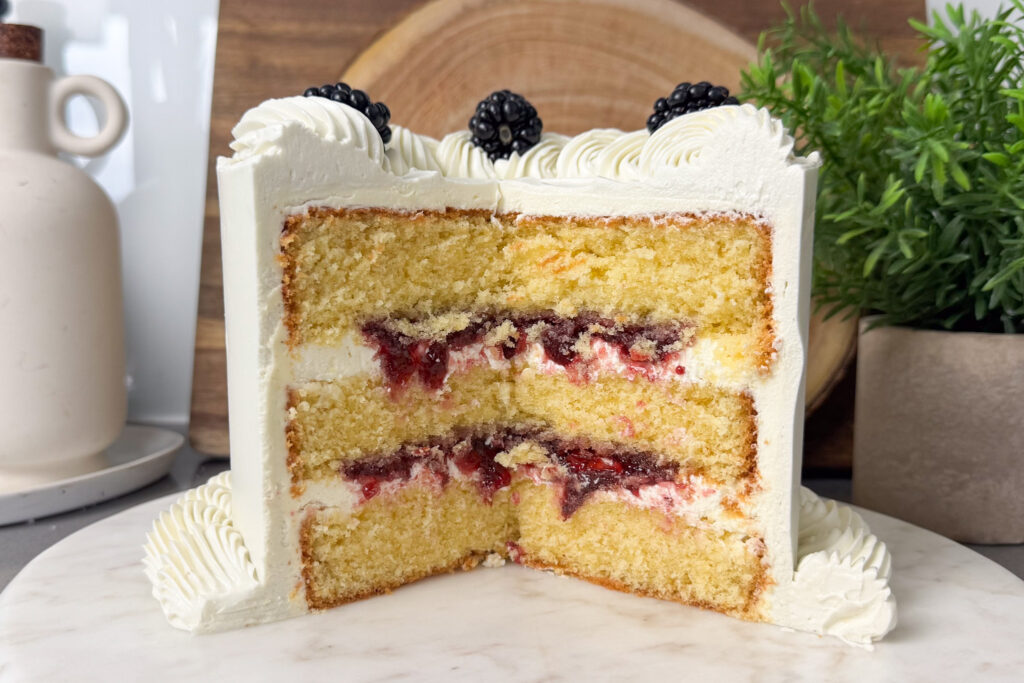 If you’ve followed me for a while, you’ll know I spent years working as a cake decorator. Celebration cakes, wedding cakes, last-minute orders, early starts, buttercream everywhere. And through all of that, there was one vanilla cake recipe I came back to again and again. I’ve shared bits and pieces of my baking over the years, but this is the first time I’m putting this one on the blog. All my customers commented on how amazing it tastes and the best thing is that it bakes up even layers so you don’t even need to trim the top. My go-to for these measurements is 3 6” layers as they bake up amazingly and give you layers that have the perfect thickness. What Makes this Vanilla Cake Special This isn’t a classic all-butter sponge, and it’s not an oil cake either. It sits somewhere in the middle – using both butter and oil for the best of both worlds. Butter gives flavour and structure Oil keeps the crumb soft and moist for days Sour cream adds richness and a gentle tang that keeps the cake from tasting flat The result is a bakery-style vanilla cake that’s velvety, even-crumbed, and sturdy enough for layering even tall cakes without ever feeling dry or heavy. Ingredients This recipe makes a generous, reliable vanilla cake base, perfect for layering. 300g caster sugar 80ml neutral oil (vegetable or sunflower) 200g unsalted butter, softened 5 large eggs, at room temperature 60g sour cream 300g self-raising flour Method 1. Prep the tins and ovenPreheat your oven to 190°C (170°C fan). Grease and line three 6” cake tins. This recipe works beautifully for layer cakes – just divide the batter evenly between tins. 2. Cream the fats and sugarAdd the sugar, oil and softened butter to a stand mixer fitted with the paddle attachment, or a large mixing bowl if you’re using a hand mixer. Beat on medium-high speed for a few minutes until the mixture looks noticeably lighter and fluffier.This step matters more than people think – you’re building air here, which gives the cake its soft structure. 3. Add the eggsAdd the eggs gradually, mixing well after each addition. The mixture may look slightly split or curdled at this stage – that’s completely normal and won’t affect the finished cake. 4. Fold in the flourSift the self-raising flour directly over the bowl. Mix on the lowest speed or fold in gently by hand until most of the flour is incorporated. Be careful not to overwork it – you want to keep as much air in the batter as possible. 5. Finish with sour creamAdd the sour cream and gently fold or mix until the batter is smooth and evenly combined. 6. BakeDivide the batter evenly between your prepared tins and level the tops. Bake for 22–25 minutes, or until a skewer inserted into the centre comes out clean.If you’re baking multiple layers at once, check them all – ovens can be uneven. 7. Cool properlyLet the cakes cool in their tins for around 15–20 minutes, then carefully turn out onto a wire rack to cool completely before filling or decorating. Decorating & Storing This vanilla cake is a dream to work with. It trims cleanly, stacks well, and holds fillings beautifully – buttercream, fruit, curd, ganache, you name it. Once baked, the sponges can be: Wrapped and stored at room temperature for a day Refrigerated for a couple of days Frozen (wrapped well) for longer storage It actually improves after a short rest, which is exactly why I relied on it so heavily when decorating cakes professionally. I usually bake the cake one day before decorating and store it in the fridge overnight.