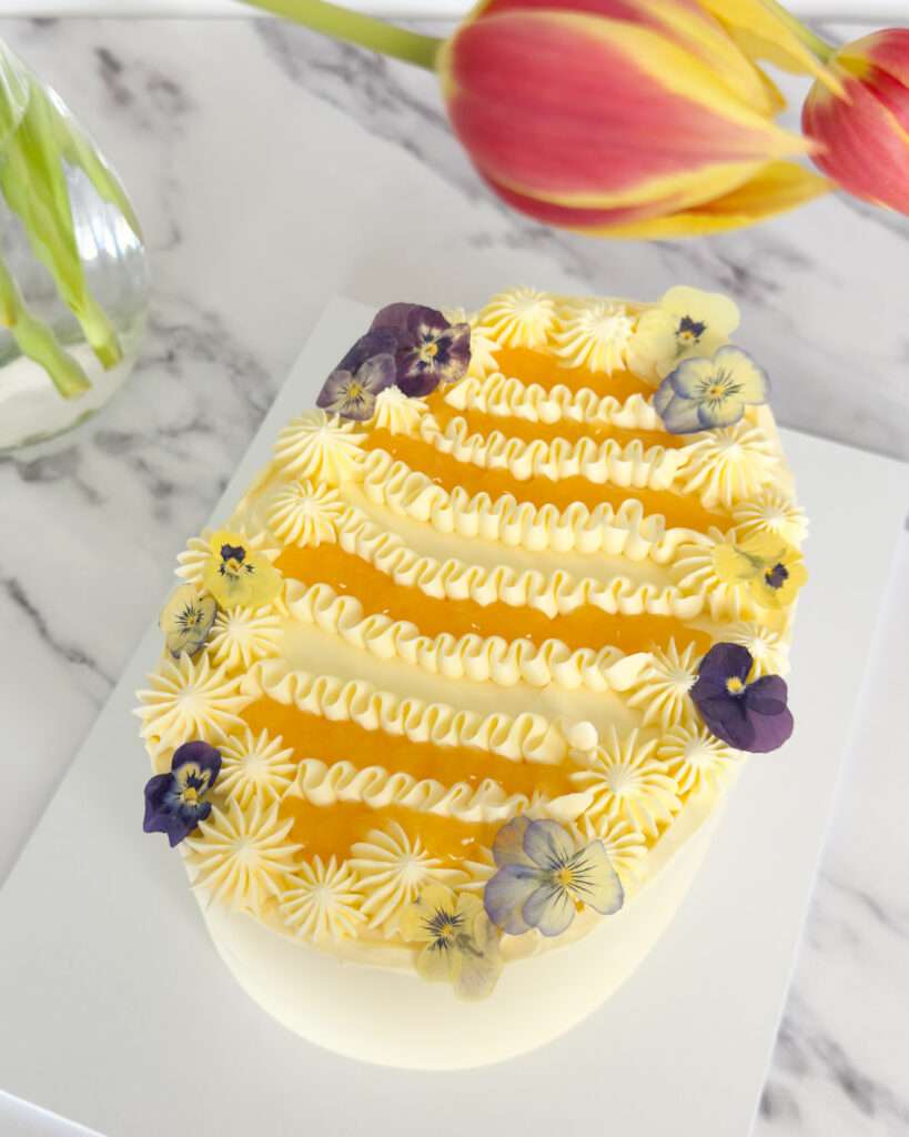 This vanilla Easter sheet cake is soft, buttery and light, filled with lemon curd, finished with silky Swiss meringue buttercream, and decorated in a simple oval design that looks so lovely for spring tables, Easter gatherings, picnics or afternoon tea. It has that fresh, delicate look that feels a little special, but it’s still very easy to make at home. I made this in a 15 x 10 inch sheet cake tin, then used the oval cake plates from The Cake Decorating Company to cut and shape the layers. The finished cake gives you two soft vanilla sponge layers, a generous filling of lemon curd and buttercream, and enough slices for around 20 people, depending on how generously you cut it. If you love a classic vanilla cake recipe but want something a little prettier for the season, this is such a good one to keep in your back pocket. Why you’ll love this vanilla Easter cake You’ll love it because: it’s based on a reliable soft vanilla cake recipe the lemon curd filling adds freshness and stops it feeling too sweet it’s easy to decorate even if you’re not confident with piping the oval shape gives it that lovely old-fashioned spring cake feel it’s ideal for Easter entertaining or any spring occasion it serves a crowd without needing a towering layer cake It also feels a bit more relaxed than a traditional celebration cake. A sheet cake is easier to bake, easier to assemble and easier to transport. Ingredients 300g caster sugar 80ml neutral oil (vegetable or sunflower) 200g unsalted butter, softened 5 eggs, at room temperature 1 tsp vanilla extract 60g sour cream 300g self-raising flour Pro tip: Room temperature eggs and sour cream are super important here – they emulsify into the batter much more smoothly and are part of why you get that even, velvety crumb. Take them out of the fridge at least 30 minutes before you start. Method 1. Prep your tins and oven Preheat your oven to 190°C (170°C fan). Grease and line your cake tin. 2. Cream the fats and sugar Add the caster sugar, oil, and softened butter to a stand mixer fitted with the paddle attachment – or a large mixing bowl if you’re using a hand mixer. Beat on medium-high speed for a few minutes until the mixture looks noticeably lighter and fluffier. This step is incredibly important. You’re building air into the batter here, and that air is what gives the finished cake its soft, open structure. 3. Add the vanilla and eggs Add the Vanilla and then the eggs one at a time, mixing well after each addition. The mixture may look slightly split or curdled at this point but that’s completely normal. Keep going. It’ll come together once the flour goes in, and it won’t affect the finished cake at all. 4. Fold in the flour Sift the self-raising flour directly over the bowl. Mix on the lowest speed, or fold in gently by hand, until most of the flour is just incorporated. The key word there is just – you want to keep as much air in the batter as possible, so don’t overwork it. 5. Finish with sour cream Add the sour cream and fold or mix gently until the batter is smooth and evenly combined. It should look glossy and uniform at this stage. 6. Bake Bake for 35-40 minutes, or until a skewer inserted into the centre comes out clean. All ovens are different and if you have to bake longer, keep checking every 5min to make sure the cake is fully baked without overbaking. 7. Let the cake cool completely Leave the cake in the tin for around 10 minutes, then carefully turn it out onto a wire rack to cool completely before cutting, filling or decorating. Don’t rush this part. A warm cake will melt buttercream and make decorating much harder than it needs to be. 8. Cut the oval cake shape Once the cake is completely cool, use the oval cake plates as a guide to cut out two oval cake layers. This is such an easy way to get that neat spring cake shape without needing a specialist tin. If you only get one clean oval from the sheet, you can carefully cut and piece together your second layer depending on the size of your template, but ideally your sponge should give you two layers. If you want very sharp edges, chill the sponge briefly before cutting. 9. Fill and Decorate I always use my signature Vanilla buttercream as base filling and for covering the cake. It’s incredibly versatile and I have another blog post to give you 9 different flavour options that go with my base recipe. Filling and Frosting Lemon curd Use a good quality lemon curd for the filling and for decoration on top. You’ll need enough for: a generous layer inside the cake small spoonfuls or swirls on top for decorating The lemon curd cuts through the sweetness of the buttercream beautifully and gives the whole cake a fresher, more spring-like flavour. Swiss meringue buttercream Use my signature Swiss meringue buttercream recipe for this cake. It’s the one I always come back to because it’s: silky and smooth not too sweet easy to spread cleanly perfect for simple piping work ideal if you want a more elegant finish than standard buttercream If you already have the recipe on your blog, I’d link it here as: Use my Swiss Meringue Buttercream Recipe You’ll want enough to: fill the centre crumb coat if needed fully frost the outside pipe the border and top decoration Storing Your Vanilla Cake This is one of those cakes that really improves after a short rest – which is a big part of why I relied on it so much when I was decorating professionally. I’d almost always bake the day before, let the sponges sit overnight in the fridge, and decorate the next morning. Once baked and cooled, the sponges can be: Wrapped tightly and stored at